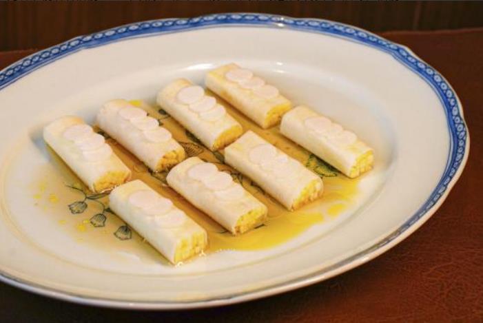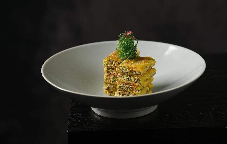 油醋咸宁甜笋卷,一品山水,满口清鲜。咸宁的灵秀山水,孕育出这道风雅之味。本地黄节瓜敦实脆嫩,自带清甜;山林甜笋,鲜嫩饱满,蕴藏着自然的野趣。以甜笋为衣,包裹节瓜细丝,切段成卷。再以咸宁板栗精心制成的栗茸点缀,平添一抹温润香甜。极鲜味汁与清冽白醋交融,勾勒出酸甜平衡的清爽风味。