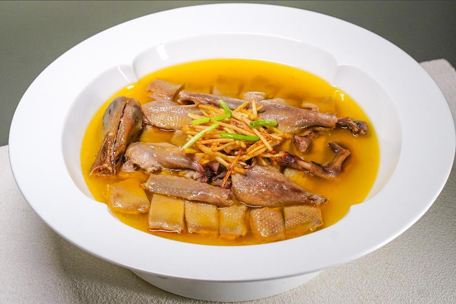 山茶油姜爆洪湖鸭,精选洪湖自然水域放养的整鸭,肉质紧实而风味纯净。以清雅山茶油与辛香老姜炝锅,注入秘制二汤,经文火慢煨两小时,鸭肉吸尽精华,酥烂而不失其形。静置冷却后精准改刀,保留鸭身完整轮廓。最后以热油激香姜丝,淋于鸭身,瞬间姜香四溢。成菜汤色清亮见底,山茶油的温润与姜的辛香交织,入口醇厚,尽显洪湖鸭的原味与本鲜。