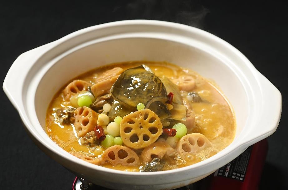 洪湖莲藕烧大湖甲,湖鲜相会,至味交融,是风土赐予的味觉经典。洪湖莲藕生于沃泥,藕节粗壮,久炖后粉糯绵香,自带清甜;大湖甲鱼出自同源水域,肉质紧实弹润,裙边宽厚,胶质丰盈。经数小时文火慢炖,甲鱼的醇厚鲜味与莲藕的温润清甜彼此渗透,汤汁自然浓稠,色泽金黄,每一口都是洪湖鱼米之乡的深厚底蕴与至鲜之味。