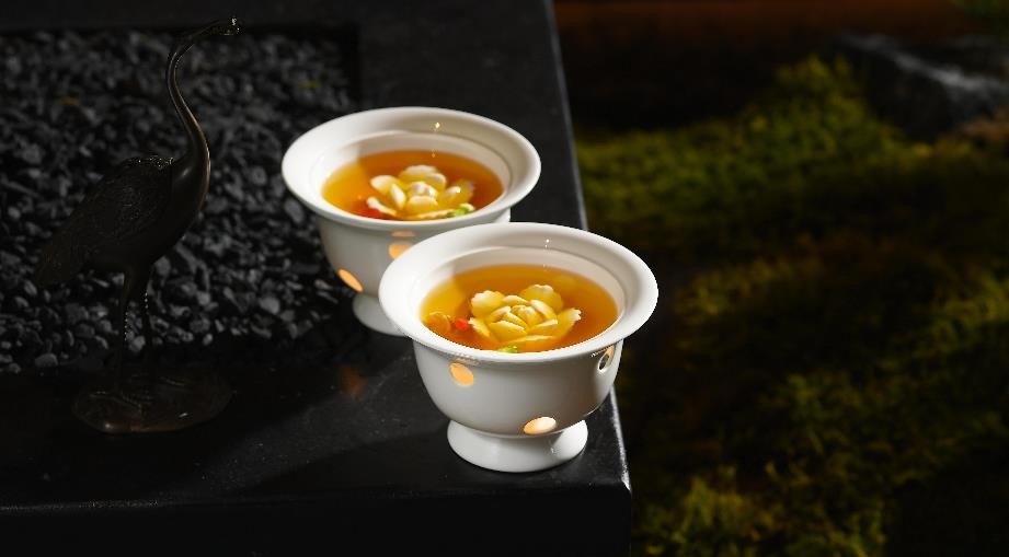 神农架菌汤牡丹豆腐,这道佳品的灵感,源自国宴名馔“开水白菜”的烹汤哲学,甄选孝感散养逾两年的土鸡,以清冽山泉慢火蒸制十二小时,汤色清亮如茶,底蕴醇厚悠长。红安永家河泉水内酯豆腐,质地莹润,毫无杂孔,因富含天然矿物质,无需石膏点制,独留纯粹豆香。将其精雕为牡丹花形,形态雅致,白净如玉。再配以神农架野生羊肚菌、松茸等山珍,同蒸八分钟。菌香渗入汤中,鲜味层层舒展,终成一道汤清、形雅、味醇的“国色天香”之味。
