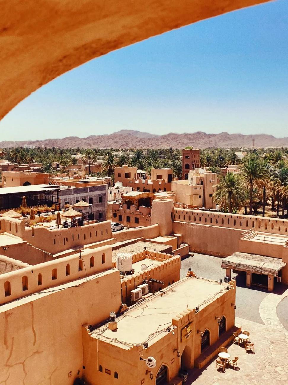 攀上塔顶,整个尼兹瓦绿洲在脚下铺展:古老的“法拉吉”水渠系统如血脉般滋养着椰枣林,泥砖民居星罗棋布,时间仿佛在此停驻。