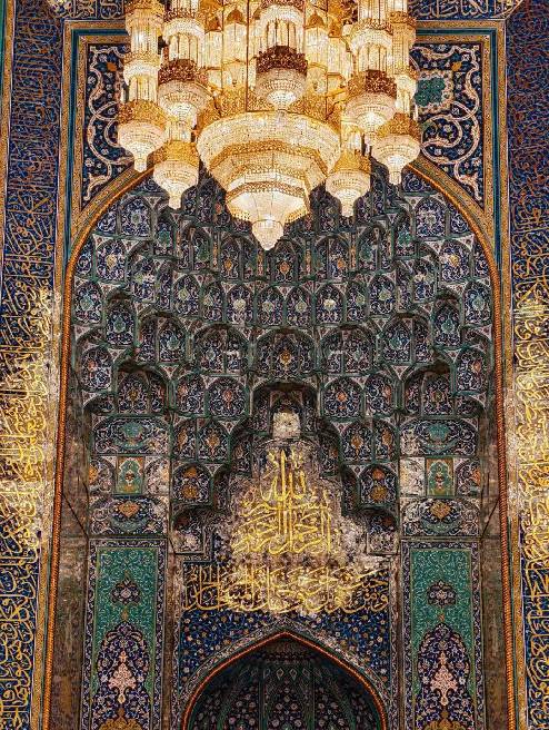 脚下是4343平方米、由600名伊朗女工耗时四年编织而成的巨型波斯地毯,头顶是14米高、缀满11万颗施华洛世水晶的枝形吊灯,当阳光透过彩窗,整个大厅流光溢彩,一种超越言语的庄严与宁静油然而生。