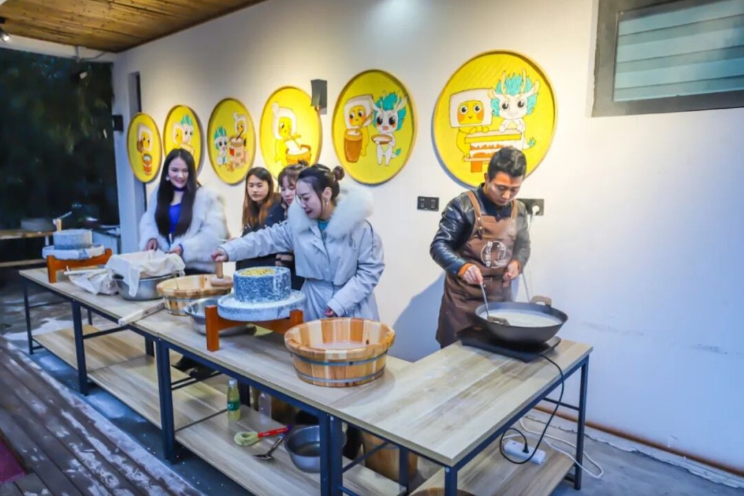 如栖迟玖宿,巧妙地将省级非遗栾川豆腐转化为可体验的日常美学。住客不仅可以了解豆腐的历史,更能亲手参与磨豆、点浆的全过程,最后围坐共享一桌创意十足的“豆腐宴”。竹林与流水环绕的静谧环境,与手工制作的温热触感,共同构建出了一种有温度的山居记忆。
