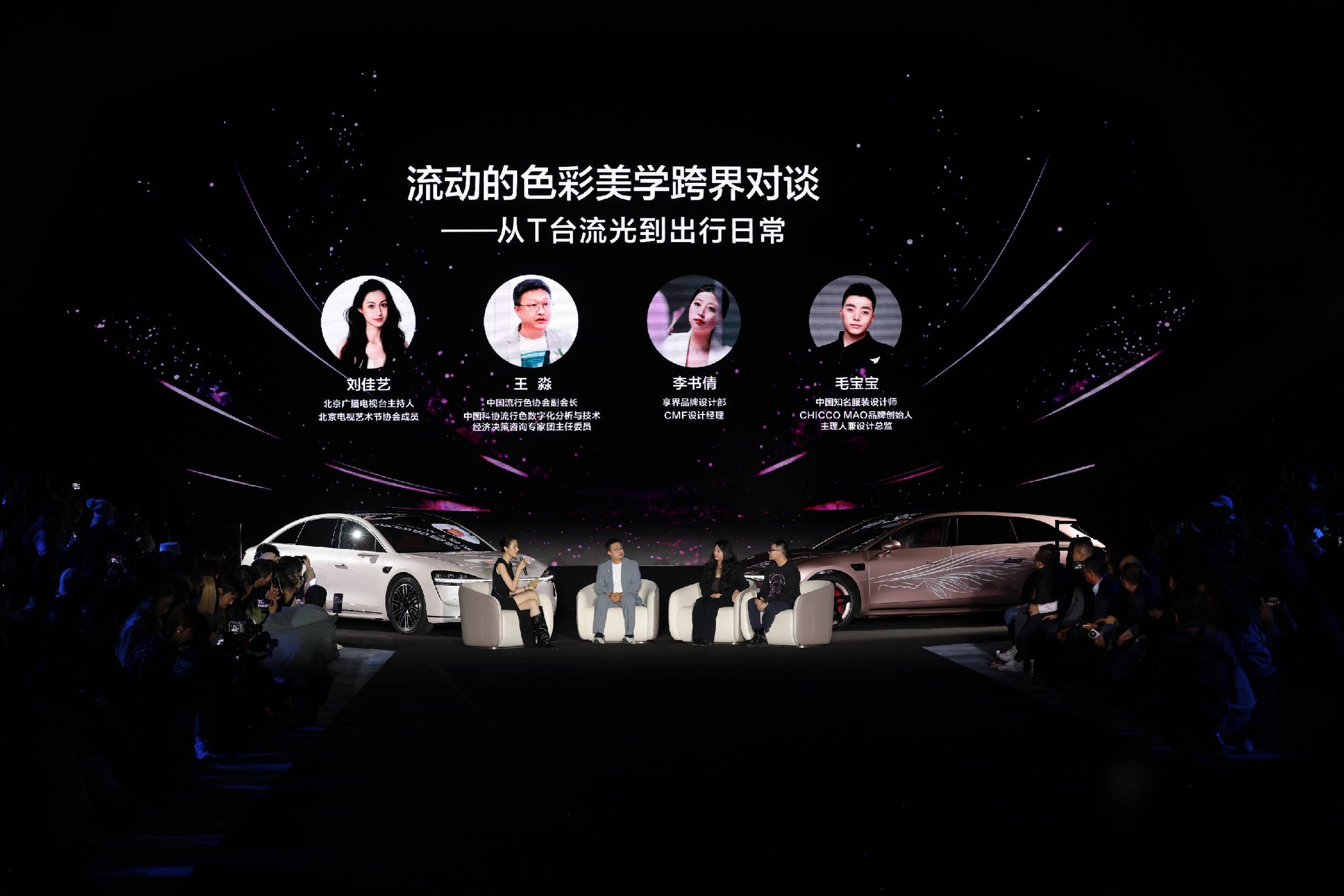 秀后,享界色彩设计师、大秀时装设计师、以及中国流行色协会副会长王淼齐聚T台,展开一场关于“寰宇美学”的深度对谈,从星玫粉的诗意与璀璨,到月绒白的摩登高级质感,共同解读色彩如何成为当代人表达自我、传递生活态度的情感载体。享界还特别设置了AI换装拍照区,让更多嘉宾与新车同框定格时尚大片,沉浸式感受寰宇美学的设计魅力。
