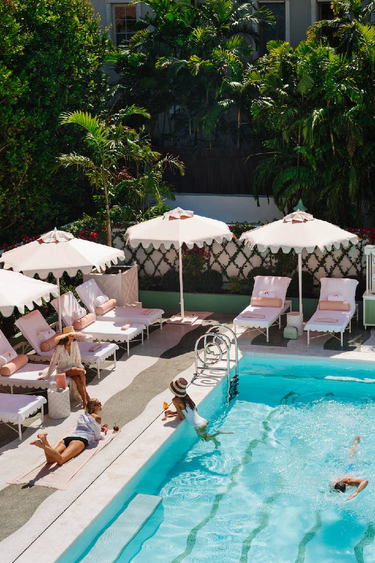 酒店的泳池区域以定制马赛克图案与贝壳形泳梯构成视觉焦点,呼应棕榈滩建筑传统。池畔躺椅与葱郁绿植环绕,营造城市中心难得的静谧绿洲。