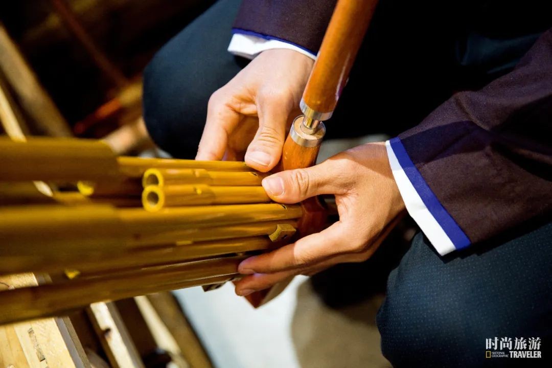 竹筒的笔直与否直接影响着芦笙的音色,气能不能直接送上去,看的就是这乐器里看不见的功夫。小小的簧片,每个部分的薄厚都决定着吹和吸的效果达成,哪里还要再削薄一点,王方许试一下,就可以当机立断。