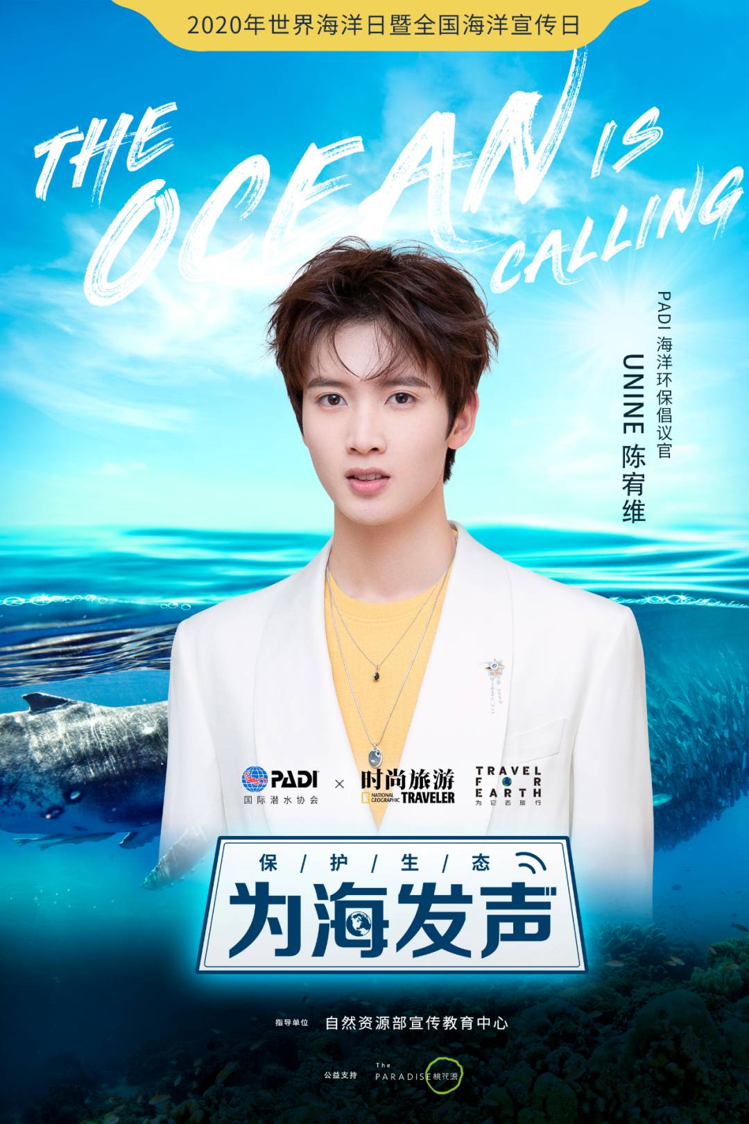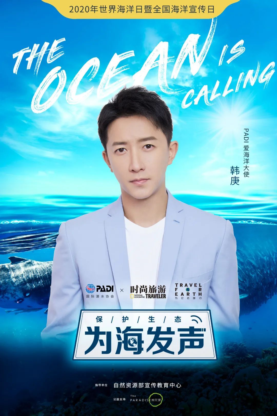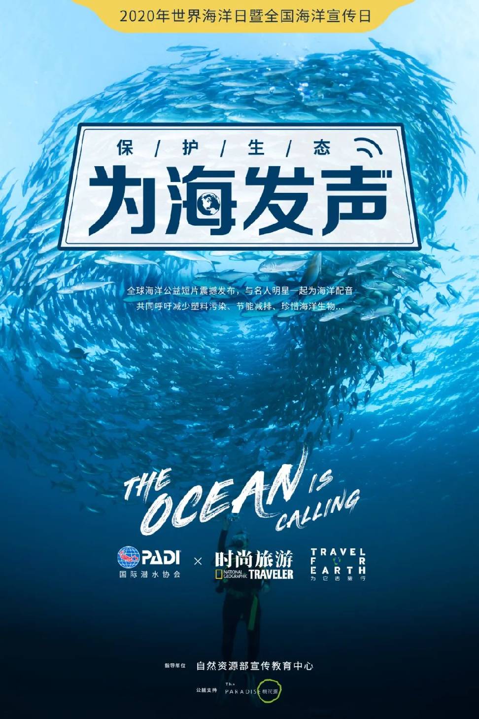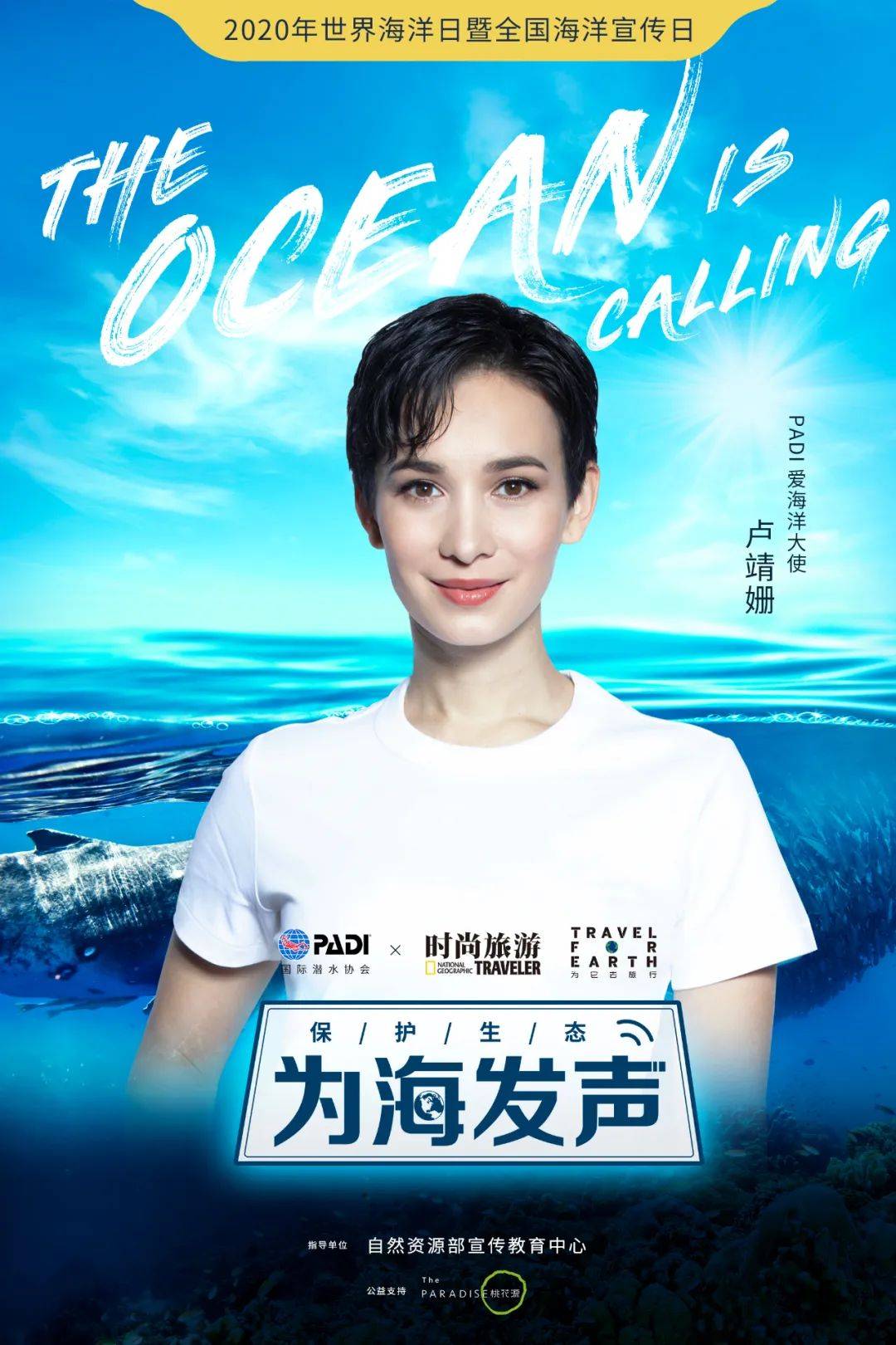 本次世界海洋日,《时尚旅游》联合PADI(国际潜水协会)发布《The Ocean is Calling》全球海洋公益片。韩庚与卢靖姗作为本次的PADI爱海洋大使,与我们共同倡议保护海洋生态,守护蔚蓝家园,一起“为它去旅行”。更有众多明星、网络大V、户外达人及各领域影响力人物,为公益片个性化配音,并在社交媒体上发起网友配音互动活动。