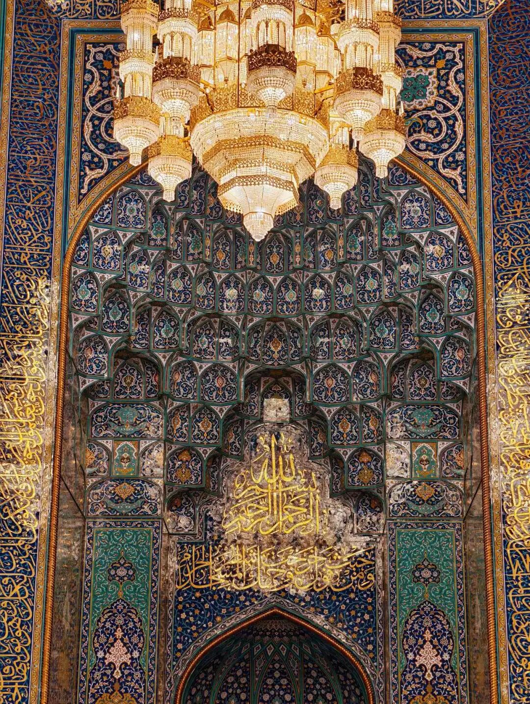 脚下是4343平方米、由600名伊朗女工耗时四年编织而成的巨型波斯地毯,头顶是14米高、缀满11万颗施华洛世水晶的枝形吊灯,当阳光透过彩窗,整个大厅流光溢彩,一种超越言语的庄严与宁静油然而生。