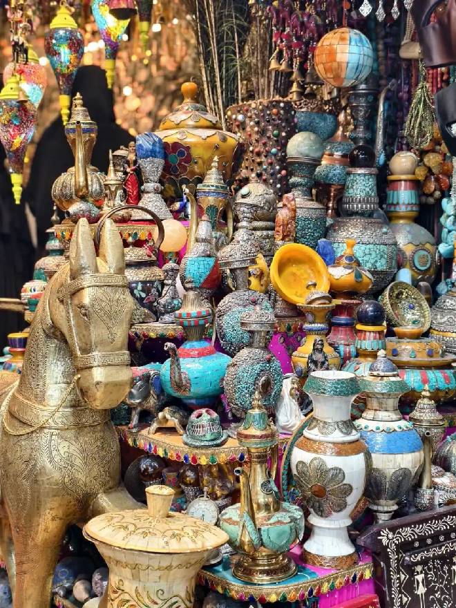 下山漫步道海边的穆特拉市集,我们瞬间被浓烈的阿拉伯风情包裹。空气中乳香暗浮,狭窄的巷弄里,银器、地毯与各式手工艺品在灯下闪烁着古老的光泽,这不正是《一千零一夜》里描绘的那个迷人世界吗?