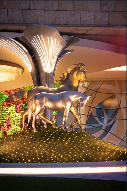 与此同时,更多别具一格的艺术装置分布在新濠天地的室内空间,继续以极具艺术美感的方式演绎“马”的灵动之姿。金光大道入口处,两匹骏马雕塑于水景之中竞相追逐,线条流畅、动感十足,结合光影,生动诠释“乘风破浪”的美好寓意。此外,连接轻轨站入口处的户外空间亦以金色骏马艺术装置点缀,宾客自抵达新濠天地之初,便能沉浸在精心营造的策马迎春氛围之中。室内外空间的现代建筑语言与传统生肖主题在此巧妙融合,展现出新濠天地一贯的艺术美学。
